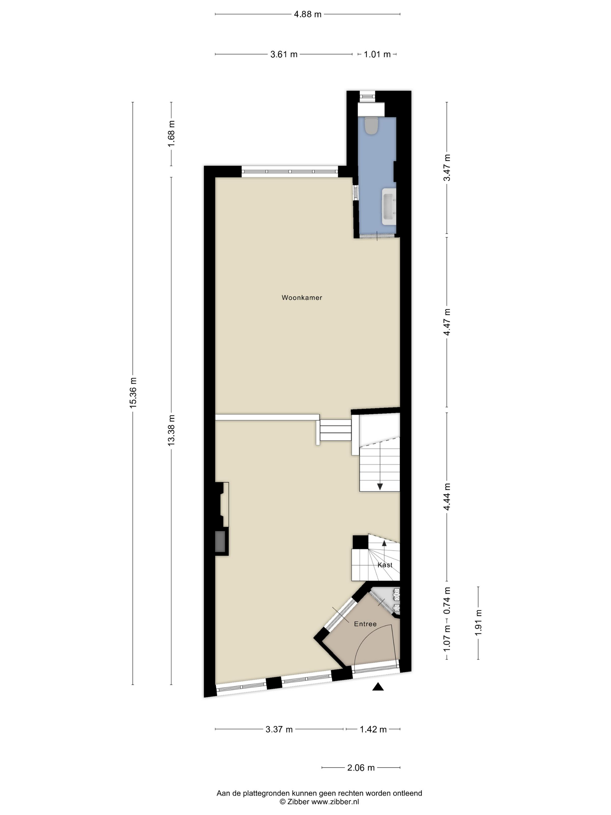 Via de afsluitbare entreehal komt in u in de woonkamer welke bijna de gehele ruimte beslaat (13.38x4.88). Open haard met schouwpartij. Halverwege de kamer brengen enkele treden u op een hoger niveau. In de aanbouw is de diepe (3.47) w.c.-ruimte gesitueerd in een schitterende Mondriaan-stijl met een brede wastafel.