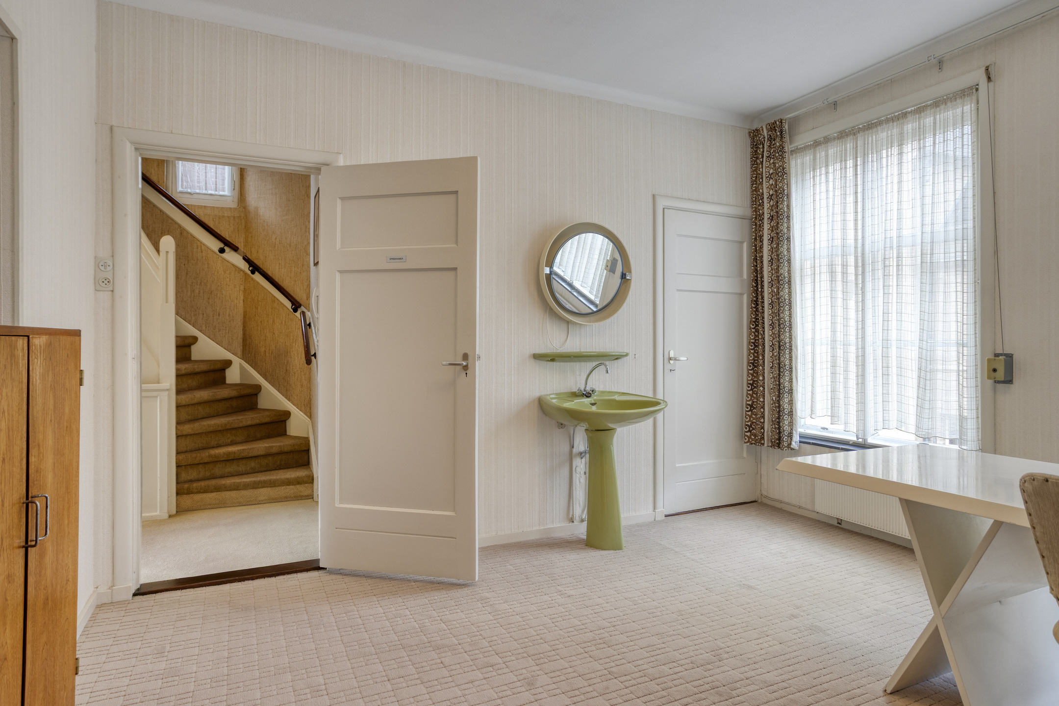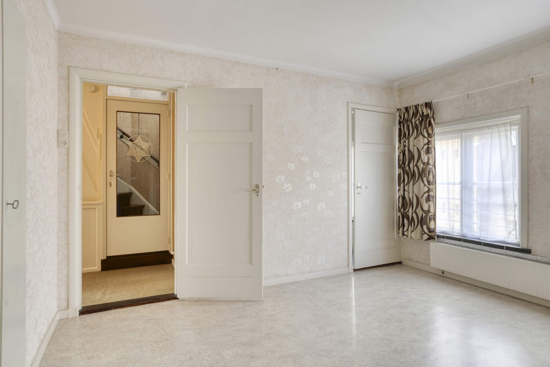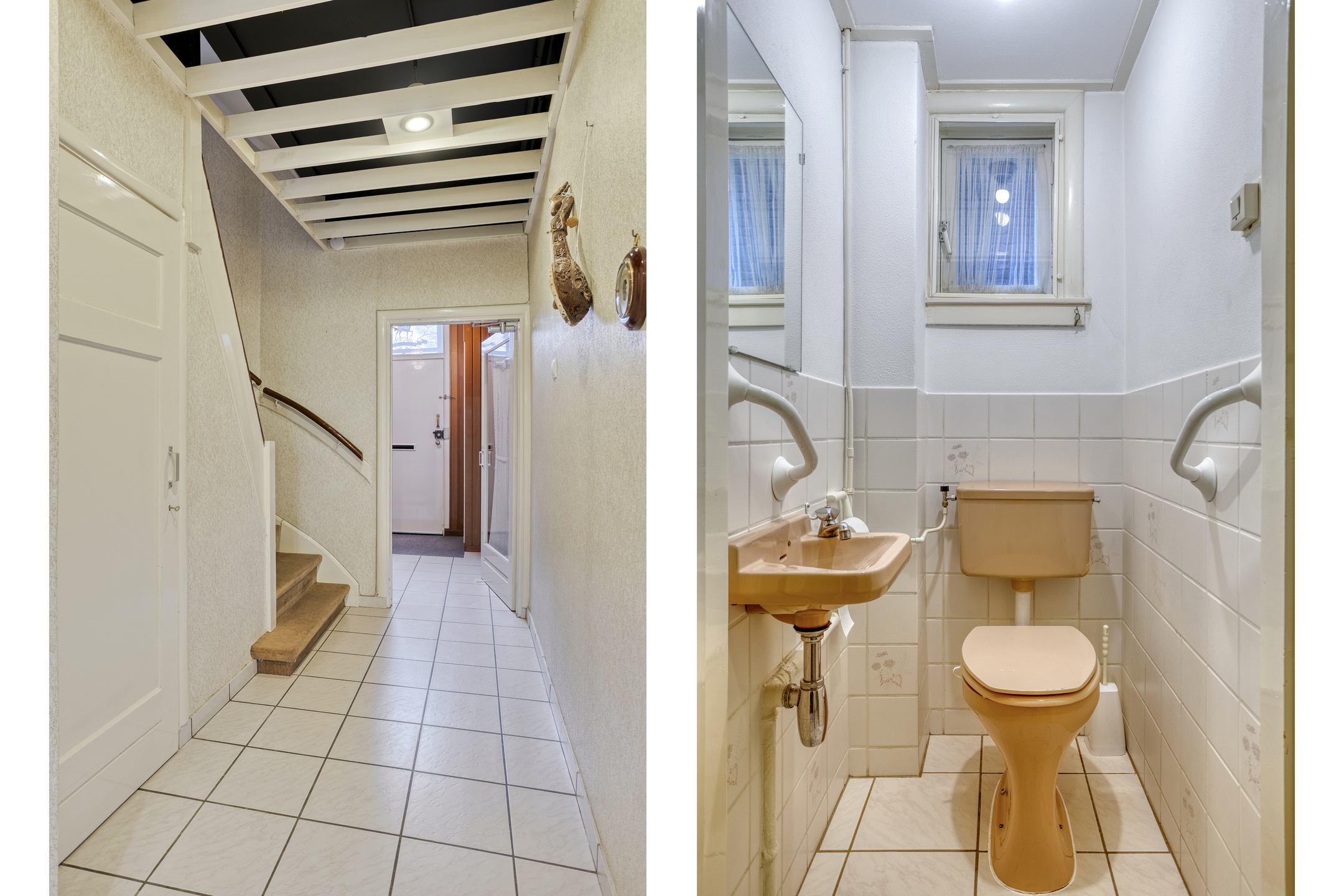 Ruime ontvangsthal (2.71x2.35). Lange gang van 6 meter met de trapopgang, trapkast, provisiekast en een w.c.-ruimte. De woonkamer met open haard is (8.92x3.95) groot.